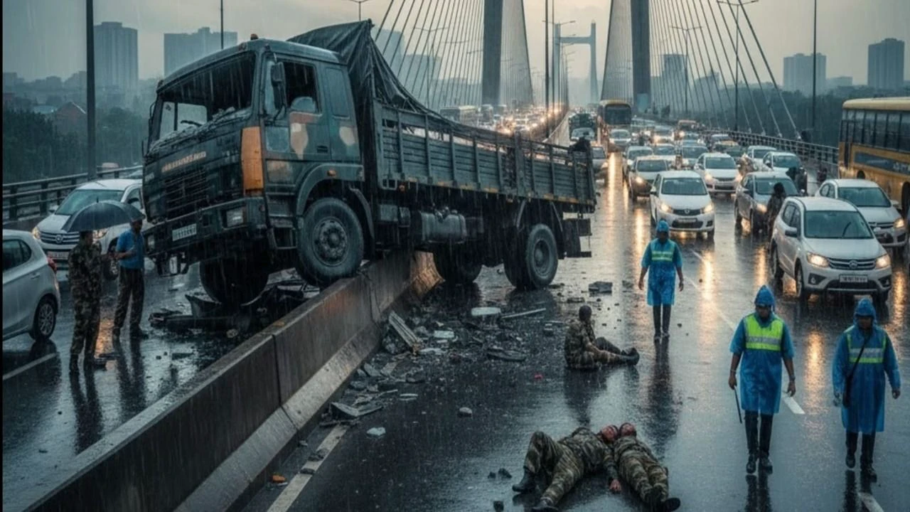 মঙ্গলবার সকালে কলকাতার মা উড়ালপুলের ওপর একটি সেনাবাহিনীর ট্রাক নিয়ন্ত্রণ হারিয়ে ভয়াবহ দুর্ঘটনার কবলে পড়ে। বৃষ্টির কারণে পিচ্ছিল রাস্তায় নিয়ন্ত্রণ হারিয়ে ট্রাকটি সজোরে উড়ালপুলের ডিভাইডারে ধাক্কা মারে। এতে ট্রাকটির সামনের অংশ দুমড়ে-মুচড়ে যায় এবং ভেতরে থাকা তিনজন সেনা জওয়ান জখম হন।